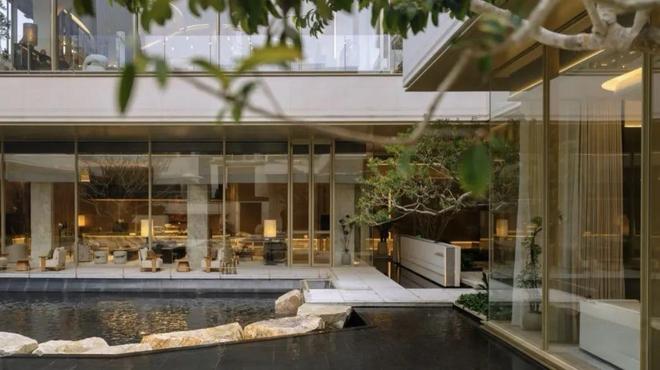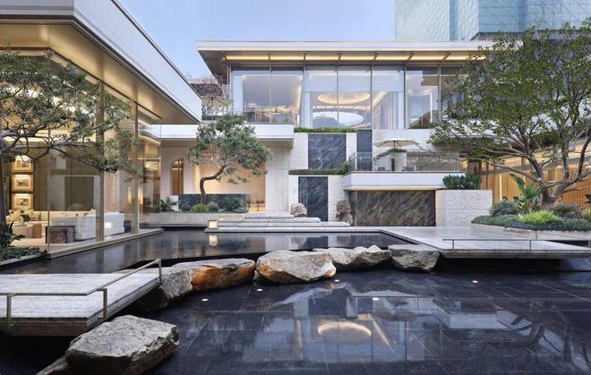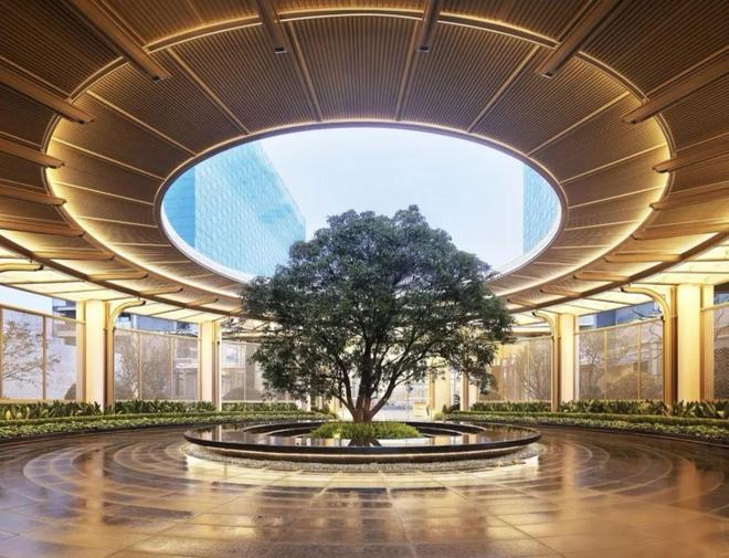 归家动线以环绕下沉式庭院布置。漫步在连廊之上,以水为引再铺陈精选的绿植,随手一拍,松弛气场油然而生。