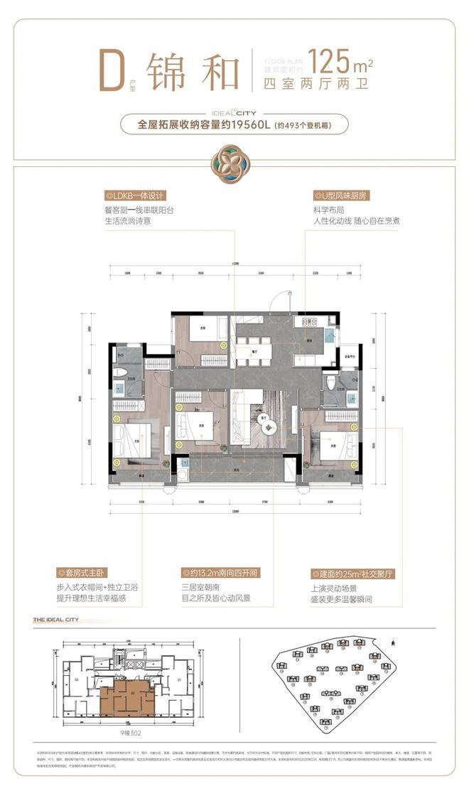 阔绰方厅+双联阳台,通风赏景至佳,还有U型厨房,三面操作空间,动线流畅好用;套房式主卧更配置了步入式衣帽间,独立卫浴设计,保证了主人家的隐私和仪式感。